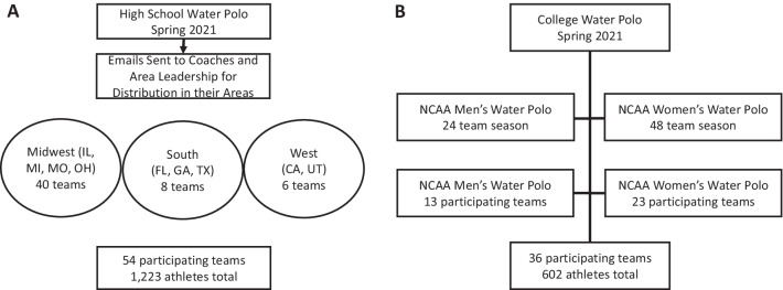 Methods: This prospective observational study enrolled 1825 water polo athletes from 54 high schools and 36 colleges. Surveys were sent to coaches throughout the season, and survey data were collected and analyzed.