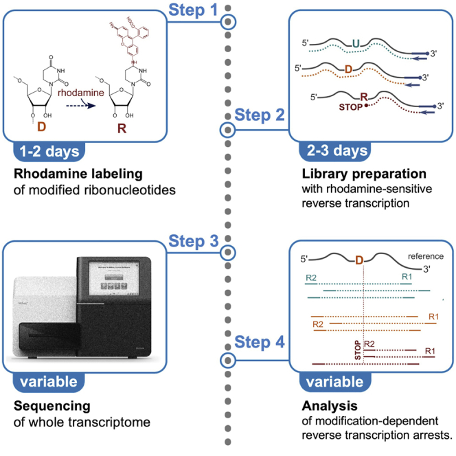 The recent development of epitranscriptomics revealed a new fundamental layer of gene expression, but the mapping of most RNA modifications remains technically challenging. Here, we describe our protocol for Rho-Seq, which enables the mapping of dihydrouridine RNA modification at single-nucleotide resolution. Rho-Seq relies on specific rhodamine-labeling of a subset of modified nucleotides that hinders reverse transcription. Although Rho-Seq was initially applied to the detection of dihydrouridine, we show here that it is applicable to other modifications including 7-methylguanosine or 4-thiouridine. For complete details on the use and execution of this protocol, please refer to Finet et al. (2022).