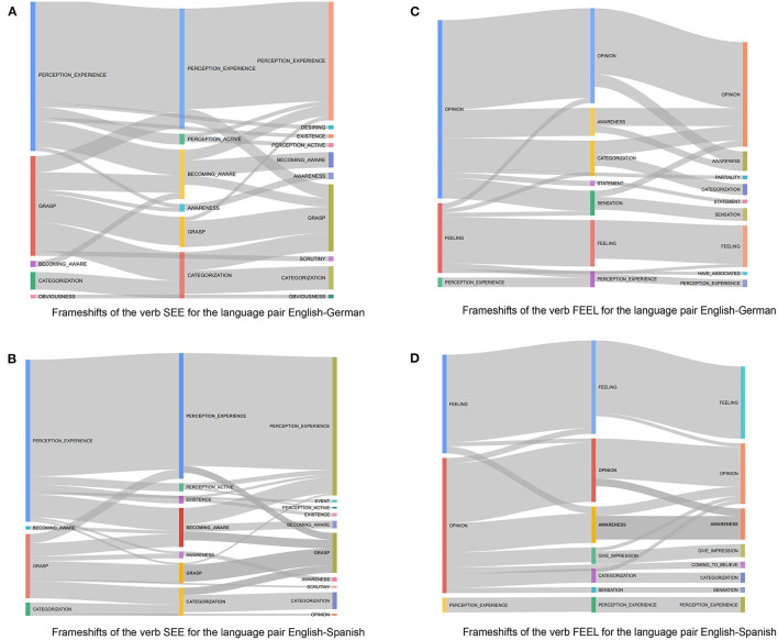 Meaning has been established pervasively as a central concept throughout disciplines that were involved in cognitive revolution. Its metaphoric usage comes to be, first and foremost, through the interpreter's constraint: representational relationships and contents are considered to be in the "eye" or mind of the observer and shared properties among observers themselves are knowable through interlinguistic phenomena, such as translation. Despite the instability of meaning in relation to its underdetermination by reference, it can be a tertium comparationis or "third comparator" for extended human cognition if gauged through invariants that exist in transfer processes such as translation, as all languages and cultures are rooted in pan-human experience and, thus, share and express species-specific ontology. Meaning, seen as a cognitive competence, does not stop outside of the body but extends, depends, and partners with other agents and the environment. A novel approach for exploring the transfer properties of some constituent items of the original natural semantic metalanguage in English, that is, semantic primitives, is presented: FrameNet's semantic frames, evoked by the primes SEE and FEEL, were extracted from EuroParl, a parallel corpus that allows for the automatic word alignment of items with their synonyms. Large Ontology Multilingual Extraction was used. Afterward, following the Semantic Mirrors Method, a procedure that consists back-translating into source language, a translatological examination of translated and original versions of items was performed. A fully automated pipeline was designed and tested, with the purpose of exploring associated frame shifts and, thus, beginning a research agenda on their alleged universality as linguistic features of translation, which will be complemented with and contrasted against further massive feedback through a citizen science approach, as well as cognitive and neurophysiological examinations. Additionally, an embodied account of frame semantics is proposed.