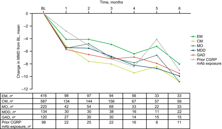 Results: Data were collected from 421 clinicians and 1003 patients. Mean (percent) reductions from baseline in MMD at Month 6 were - 7.7 (77.0%) in EM patients, - 10.1 (68.7%) in CM patients, - 10.8 (80.6%) in the MO subgroup, - 9.9 (68.3%) in the MDD subgroup, - 9.5 (66.4%) in the GAD subgroup, and - 9.0 (68.7%) in the prior CGRP mAb exposure subgroup. Improvements in MDD or GAD severity were reported by 45.5% and 45.8% of patients with comorbid MDD or GAD, respectively.