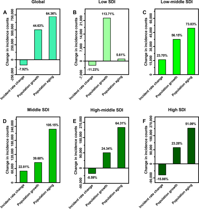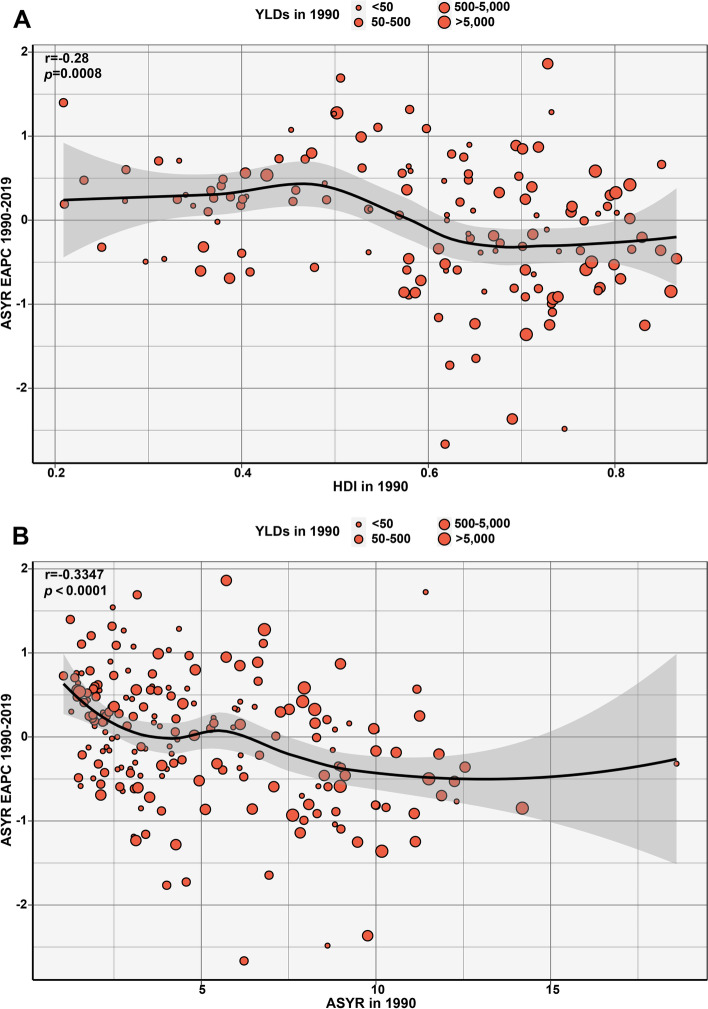 Results: Globally, the ASR of lung cancer prevalence, incidence and YLDs in 2019 were 38.84/100,000 persons, 27.66/100,000 persons, and 6.62/100,000 persons, respectively. Over the past 30 years, the ASR of incidence (EAPC = -0.09) decreased, although that of prevalence (EAPC = 0.51) and YLDs (EAPC = 0.03) increased. The global prevalence counts was greater in males than females at all age groups and increased with age, peaking in the 65-69 age group for both sexes. The increase in incidence was mainly attributed to population aging. For YLDs, EAPC was negatively correlated with the human development index (p = 0.0008) and ASR (p < 0.0001) in 1990 across nation-level units.