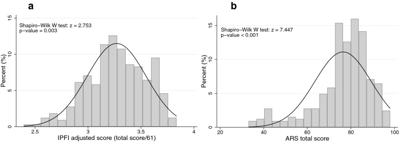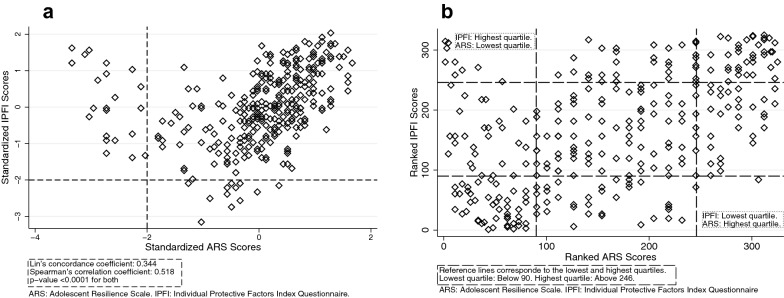 Results: 325 adolescents (41.5% female) participated in the study (72.5% response rate). Mean age was 12.1 years (standard deviation [SD]: 1.04). Of a possible score from 1-4, the mean adjusted IPFI score was 3.3 (SD: 0.3; Cronbach's alpha: 0.87). Of a possible score from 21-105, the total ARS score was 76.4 (SD 13.0; Cronbach's alpha: 0.82); both distributions were non-normal and left-skewed. The Lin's concordance correlation coefficient was 0.34 and the Spearman correlation coefficient was 0.52 (p-value < 0.0001 for both). Notably, 10 adolescents (3.1% of the sample) had a score in the lowest quartile in one of the two instruments, and a score in the highest quartile in the other instrument.