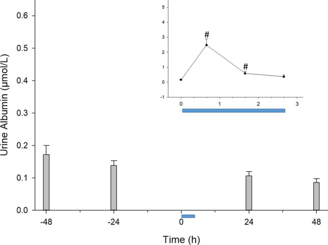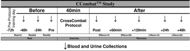 We have been using sportomics to understand hypermetabolic stress. Cross Combat (CCombat) has recently been initiated as a high-intensity functional training method inspired by CrossFit. We used a CCombat session to induce metabolic stress and evaluated its effects on hydration and kidney function. Blood samples were collected from 16 elite-level professional male athletes engaged in training sessions over a 96-h protocol. Blood myoglobin increased by ~ 3.5-fold (119 ± 21 to 369 ± 62 nmol/L; p = .001) in response to the protocol, returning to the pre-exercise level within 48 h. Furthermore, D-dimer levels increased from 6.5 ± 0.6 to 79.4 ± 21.3 μmol/L (p < .001) in response to exercise decreasing during recovery with high variability among the studied athletes. Albuminemia and creatininemia increased ~ 10% and cystatin C increased ~ 240% (1.7 ± 0.1 to 5.7 ± 0.5 mg/L; p < .001; effect size = 2.4) in response to the protocol. We measured albuminuria (HuA) to assess kidney permeability to albumin caused by exercise. HuA increased ~ 16-fold (0.16 ± 0.03 to 2.47 ± 0.41 μmol/L; p < .001; effect size = 1.4) in response to exercise, dropping and reaching basal levels during 48 h. Here, we suggest that microalbuminuria can be used as an early, sensitive, easy, and inexpensive biomarker to evaluate hydration status changes during intensive exercise, decreasing chronic impairment in renal function.
