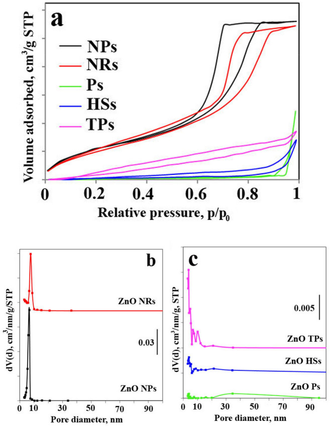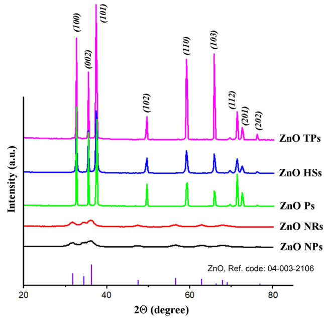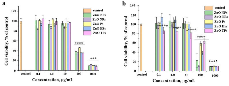 The aim of our work was the synthesis of ZnO nano- and microparticles and to study the effect of shapes and sizes on cytotoxicity towards normal and cancer cells and antibacterial activity toward two kinds of bacteria. We fabricated ZnO nano- and microparticles through facile chemical and physical routes. The crystal structure, morphology, textural properties, and photoluminescent properties were characterized by powder X-ray diffraction, electron microscopies, nitrogen adsorption/desorption measurements, and photoluminescence spectroscopy. The obtained ZnO structures were highly crystalline and monodispersed with intensive green emission. ZnO NPs and NRs showed the strongest antibacterial activity against Escherichia coli and Staphylococcus aureus compared to microparticles due to their high specific surface area. However, the ZnO HSs at higher concentrations also strongly inhibited bacterial growth. S. aureus strain was more sensitive to ZnO particles than the E. coli. ZnO NPs and NRs were more harmful to cancer cell lines than to normal ones at the same concentration.