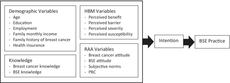 Methods: The cross-sectional study was conducted on 204 women aged 18-65 years in Surabaya, Indonesia. A 64-item survey was conducted, included variables from the Reasoned Action Approach, and the Health Belief Model, presented questions about demographics, breast cancer knowledge, and behavior related to BSE.