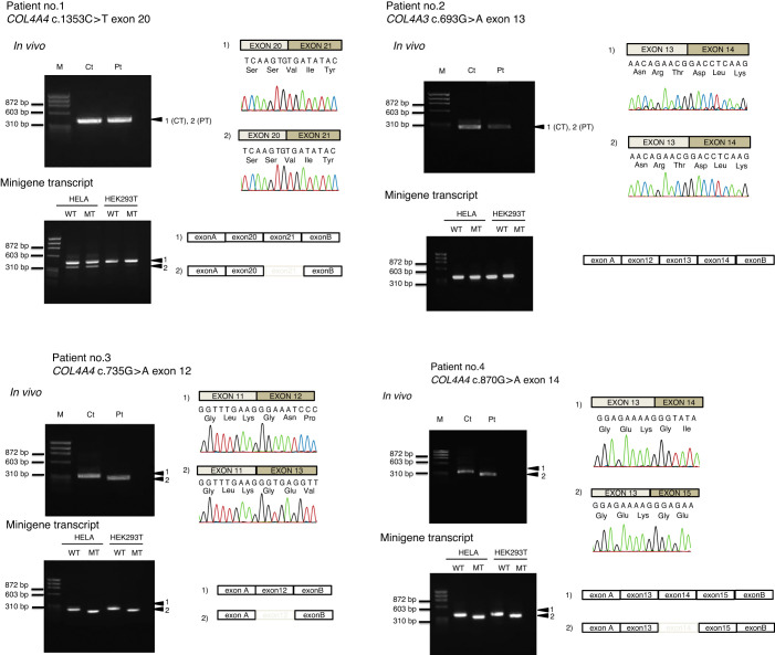 Methods: We conducted in silico splicing analysis using Human Splicing Finder (HSF) and Alamut to predict splicing domain strength and disruption of the sites. Furthermore, we performed in vitro splicing assays using minigene constructs and mRNA analysis of patient samples to determine the pathogenicity of four synonymous variants detected in four patients with suspected autosomal dominant Alport syndrome (COL4A3 [c.693G>A (p.Val231=)] and COL4A4 [c.1353C>T (p.Gly451=), c.735G>A (p.Pro245=), and c.870G>A (p.Lys290=)]).