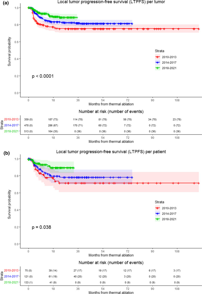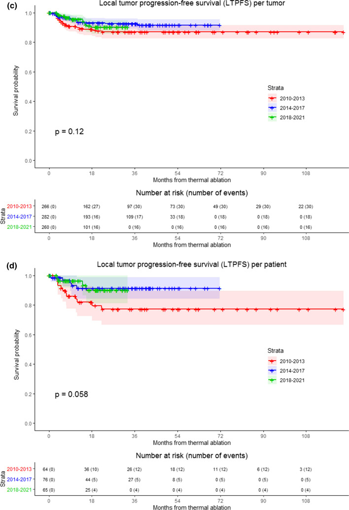 Results: LTPFS improved significantly over time for percutaneous ablations (2-year LTPFS 37.7% vs. 69.0% vs. 86.3%, respectively, P < .0001), while LTPFS for open ablations remained reasonably stable (2-year LTPFS 87.1% [2010-2013], vs. 92.7% [2014-2017] vs. 90.2% [2018-2021], P = .12). In the latter cohort (2018-2021), the open approach was no longer superior regarding LTPFS (P = .125). No differences between the three cohorts were found regarding OS (P = .088), length of hospital stay (open approach, P = .065; percutaneous approach, P = .054), and rate and severity of complications (P = .404). The rate and severity of complications favored the percutaneous approach in all three cohorts (P = .002).