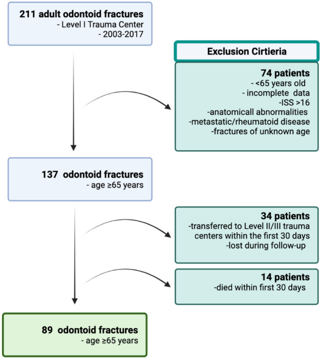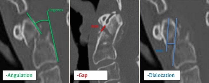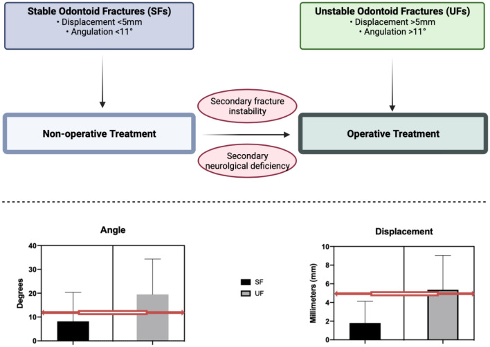 Methods: There were 89 patients ≥ 65 years who presented at our institution with type II and III odontoid fractures from 2003 until 2017 and were included in this study. Each patient was categorized with CT scans to evaluate the type of fracture, fracture gap (mm), fracture angulation (°), fracture displacement (mm) and direction (ventral, dorsal). Fractures were categorized as stable [SF] or unstable [UF] distinguished by the parameters of its angulation (< / > 11°) and displacement (< / > 5 mm) with a follow-up time of 6 months. SFs were treated with a semi-rigid immobilization for 6 weeks, UFs surgically-preferably with a C1-C2 posterior fusion.