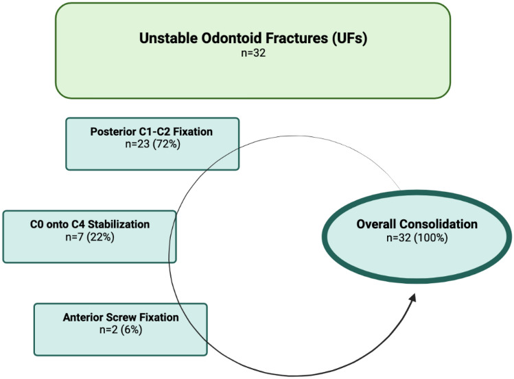 Results: The classification into SFs and UFs was significant for its angulation (P = 0.0006) and displacement (P < 0.0001). SF group (n = 57): A primary stable union was observed in 35, a stable non-union in 10, and an unstable non-union in 8 patients of which 4 were treated with a C1/2 fixation. The overall consolidation rate was 79%. UF group (n = 32): A posterior C1-C2 fusion was carried out in 23 patients, a C0 onto C4 stabilization in 7 and an anterior odontoid screw fixation in 2. The union rate was 100%. Twenty-one type II SFs (91%) consolidated with a nonoperative management (P < 0.001). A primary non-union occurred more often in type II than in type III fractures (P = 0.0023). There was no significant difference in the 30-day overall case fatality (P = 0.3786).