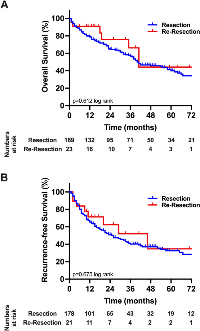 Results: Comparative analysis showed no statistical difference between the resection and re-resection group in terms of age (p = 0.204), gender (p = 0.180), ASA category (p = 0.346) as well as main preoperative tumor characteristics, liver function parameters, operative variables, and postoperative complications (p = 0.851). The perioperative morbidity (Clavien-Dindo ≥ 3a) and mortality were 21.7% (5/23) and 8.7% (2/23) in rHCC, while 25.4% (48/189) and 5.8% (11/189) in primary HCC, respectively (p = 0.851). The median overall survival (OS) and recurrence-free survival (RFS) in the resection group were 40 months and 26 months, while median OS and RFS were 41 months and 29 months in the re-resection group, respectively (p = 0.933; p = 0.607; log rank).