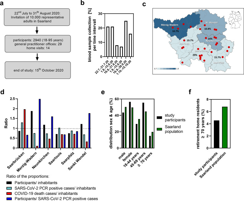 Background: Reliable data on the adult SARS-CoV-2 infection fatality rate in Germany are still scarce. We performed a federal state-wide cross-sectional seroprevalence study named SaarCoPS, that is representative for the adult population including elderly individuals and nursing home residents in the Saarland.