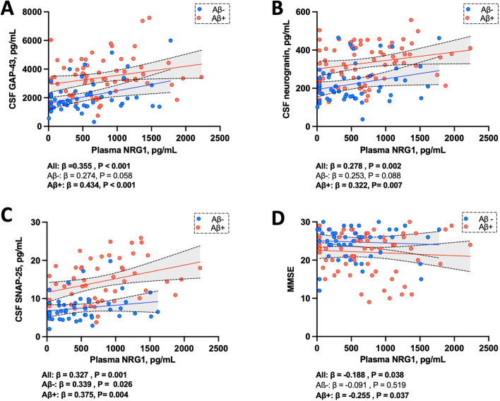 Results: Plasma NRG1 concentration was higher in AD-MCI and AD dementia patients compared with neurological controls (respectively P = 0.005 and P < 0.001). Plasma NRG1 differentiated AD MCI patients from neurological controls with an area under the curve of 88.3%, and AD dementia patients from NC with an area under the curve of 87.3%. Plasma NRG1 correlated with CSF NRG1 (β = 0.372, P = 0.0056, adjusted on age and sex). Plasma NRG1 was associated with AD CSF core biomarkers in the whole cohort and in Aβ-positive patients (β = -0.197-0.423). Plasma NRG1 correlated with CSF GAP-43, neurogranin, and SNAP-25 (β = 0.278-0.355). Plasma NRG1 concentration correlated inversely with MMSE in the whole cohort and in Aβ-positive patients (all, β = -0.188, P = 0.038; Aβ+: β = -0.255, P = 0.038).