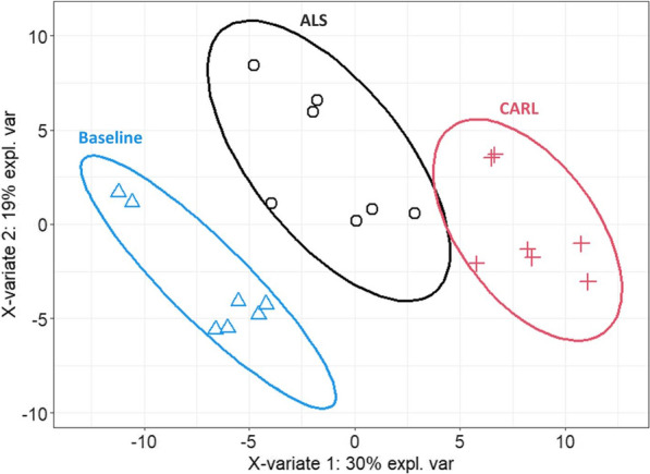Results: N = 21 serum samples were measured resulting in the identification and quantification of 308-360 proteins per sample and 388 unique proteins in total. The three serum proteome profiles at the investigated time points clustered individually and segregated almost completely when considering a 90% confidence interval. Differential expression analysis showed significant abundance changes in 27 proteins between baseline and after CPR and in 9 proteins after CARL compared to CPR. Significant findings were further validated through a co-abundance cluster analysis corroborating the observed abundance changes.