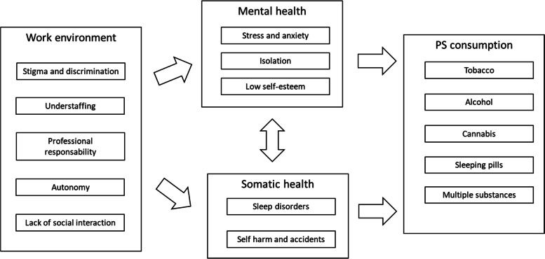 Results: Stigma against NSHW was a primary element of a stressful work environment. The stressful and stigmatizing environment, together with night-shift work, further affected NSHW sleep and their mental and physical health. The use of PS appeared to be for self-medication, encouraged by social and professional environments, source(s) of stress, discrimination, and isolation. The work environment, through aggravated sleep disorders, led NSHW to use non-prescribed sleeping pills. Alcohol after work and smoking were used as a social break but also as a means to reduce stress.