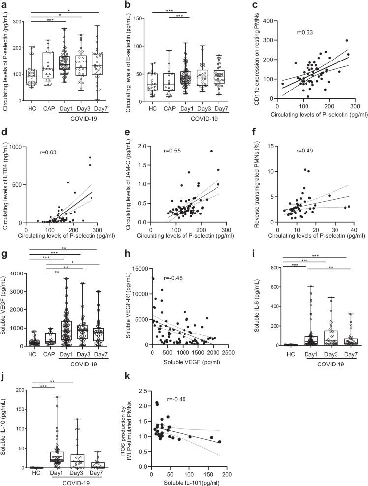 Results: At ICU admission, the circulating neutrophils of the COVID-19 patients showed continuous basal hyperactivation not seen in CAP patients, associated with higher circulating levels of soluble E- and P-selectin, which reflect platelet and endothelial activation. Furthermore, COVID-19 patients had expanded aged-angiogenic and reverse transmigrated neutrophil subsets-both involved in endothelial dysfunction and vascular inflammation. Simultaneously, COVID-19 patients had significantly lower levels of neutrophil oxidative burst in response to bacterial formyl peptide. Moreover patients dying of COVID-19 had significantly higher expansion of aged-angiogenic neutrophil subset and greater impairment of oxidative burst response than survivors.