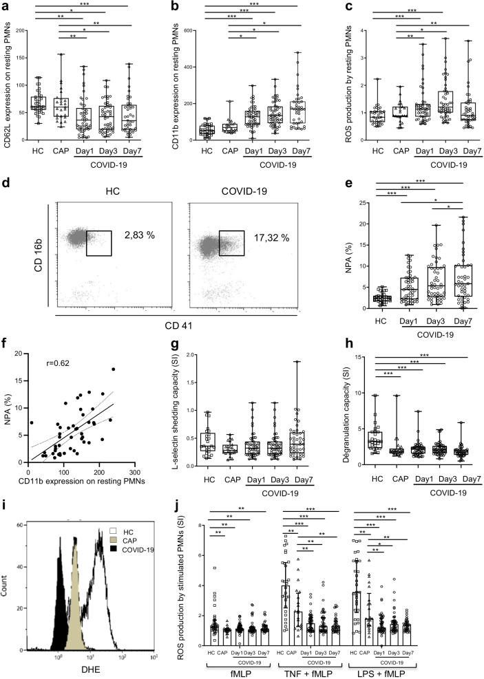 Methods: By using flow cytometry, this longitudinal study compares peripheral whole-blood neutrophils from 90 COVID-19 ICU patients with those of 22 SARS-CoV-2-negative patients hospitalized for severe community-acquired pneumonia (CAP) and 38 healthy controls. We also assessed correlations between these phenotypic and functional indicators and markers of endothelial damage as well as disease severity.