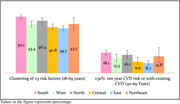 Results: The overall survey response rate was 96.3%. The prevalence of current tobacco (45.7%) and alcohol use (22.3%) was significantly high in the northeast region. The highest proportion of adults from northern India showed low levels of physical activity (49.6%). The prevalence of metabolic risk factors - obesity (12.5%), raised fasting blood glucose (21.2%) and raised blood pressure (35.6%) was highest in south India. The prevalence of raised blood pressure was high in north India (35.2%) similar in proportion to south India. Clustering of ≥3 risk factors (50.1%) and ten-year CVD risk of ≥30% or with existing CVD (18.1%) was highest in south India when compared to other regions. Older age, urban residents, alcohol consumption and overweight/obesity were significantly associated with higher odds of raised blood pressure and raised fasting blood glucose.