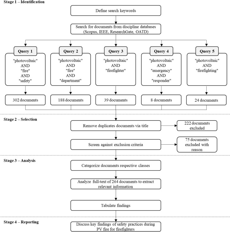 In recent years, it is evident that there is a surge in photovoltaic (PV) systems installations on buildings. It is concerning that PV system related fire incidents have been reported throughout the years. Like any other electrical power system, PV systems pose fire and electrical hazards when at fault. As a consequence, PV fires compromised the safety of emergency responders. Therefore, the objective of this review is to evaluate the elements of firefighters' safety practices and subsequently collate the best safety practices for local fire rescue and firefighters in the event of PV fires. Out of 264 documents, only 20 publications were identified as 'closely related' and were systematically reviewed to evaluate firefighter safety practices from a scholarly perspective. Only 3% of the 20 publications reviewed, discussed the safety practices during PV fires. Thirteen safety practice key points were extracted from the reviewed documents, with nine critical findings highlighted as the hallmark of safety practices during PV fire for firefighters. The lack of academic journals discussing the fire safety aspects proves that there is a low interest in this field which is in dire need of further study and exploration to adhere with the PV population in ensuring a reliable emergency operation to minimize losses or injuries due to accidents.