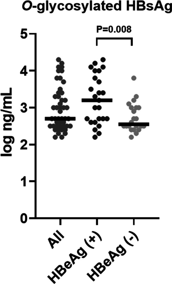 Background: Serum hepatitis B surface antigen (HBsAg) is a component of both hepatitis B virus (HBV) virions and non-infectious subviral particles (SVPs). Recently, O-glycosylation of the PreS2 domain of middle HBsAg protein has been identified as a distinct characteristic of genotype C HBV virions versus SVPs. This study aimed to evaluate serum O-glycosylated HBsAg levels in patients with chronic hepatitis B (CHB) treated with nucleos(t)ide analogs (NAs).