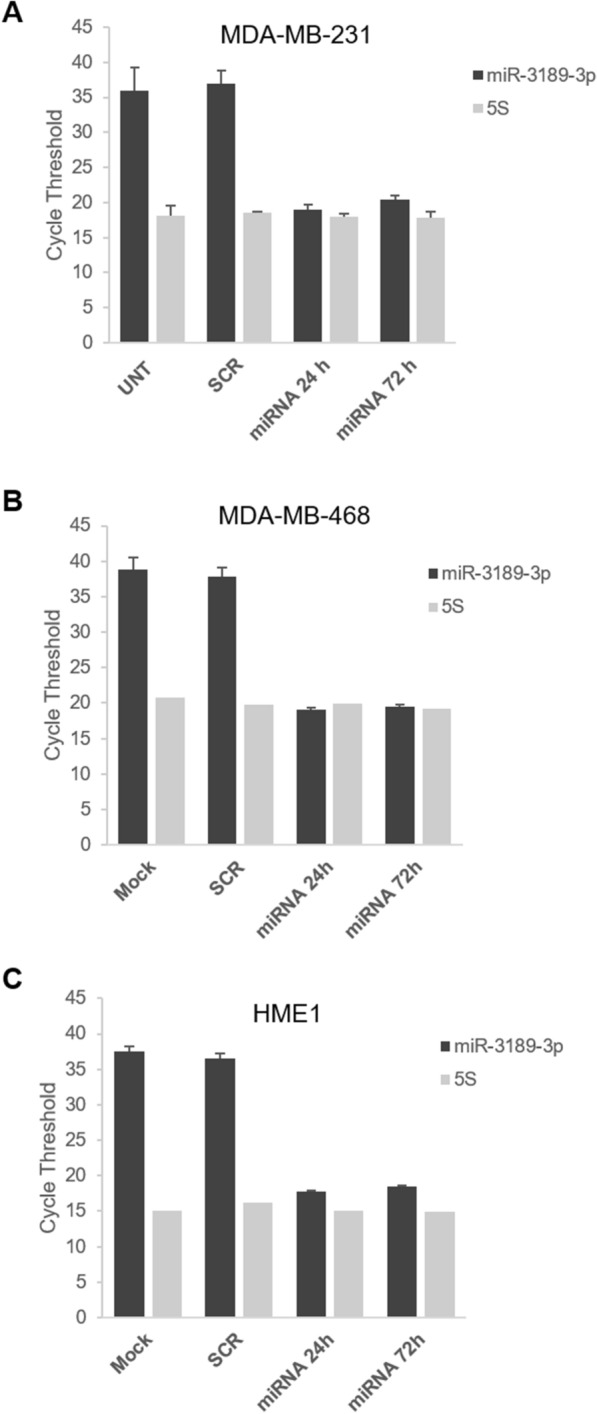 Background: Triple negative breast cancer (TNBC) is an aggressive subtype of breast cancer characterized by the lack of estrogen receptor, progesterone receptor, and HER2. Our lab previously characterized miR-3189-3p as a microRNA with potent anti-cancer activity against glioblastoma. Here, we hypothesized a similar activity in TNBC cells. As miR-3189-3p is predicted to target a variety of RNA binding proteins, we further hypothesized an inhibitory effect of this miRNA on protein synthesis.