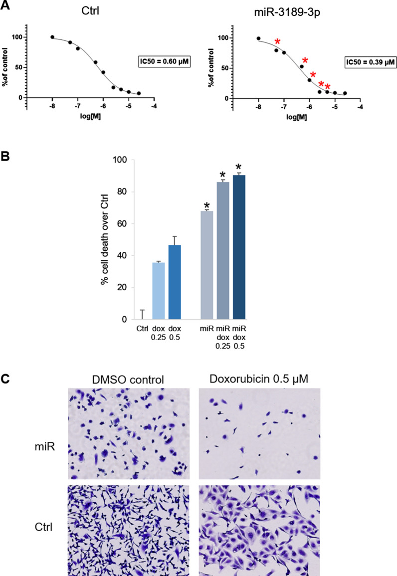 Conclusion: Overall, results indicated that miR-3189-3p exerts its anti-tumor activity through targeting translational regulatory proteins leading to an impairment in c-MYC translation, and possibly other oncogenic factors, suggesting that miR-3189-3p, alone or in combination, could be a valuable therapeutic approach against a malignancy with few treatment options.
