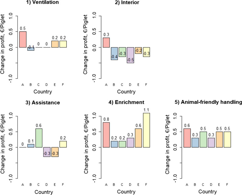 Results: Piglet mortality can be decreased in various ways. Interventions concerning ventilation and re-designing of the gestation unit (1 and 2) were the most beneficial in countries with low housing costs and high perinatal mortality. Drying and warming newborn piglets (3) resulted in varying economic results, with the highest increase in profits obtained in a country with low labor costs and high litter size. Interventions providing sows with enrichment and human-animal interaction (4 and 5) were effective across varying conditions. Regardless of intervention type, policies aiming at 1%-point reduction in perinatal and pre-weaning mortality could cost from €0.2 to €0.5 (average €0.4) and from €0.4 to €0.5 (average €0.5) per piglet, respectively, depending on productions conditions.