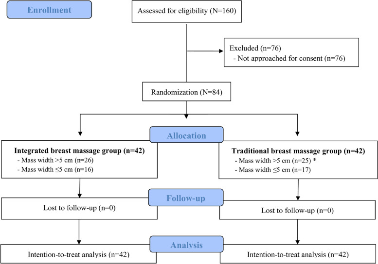 Results: Eighty-four women (42 per group) were included. All enrolled study participants completed the study and were included in the final analysis. Twenty-six (61.9%) and 25 (59.5%) participants from IBM and TBM, respectively, had mass diameter > 5 cm. The median (interquartile range [IQR]) mass size was 30 (20-48) and 20 (12-14) cm2 in IBM and TBM (p = 0.05), respectively. The median (95% CI) time to resolution of plugged duct was 0 (not available) and 1 (0.47-1.53) day in IBM and TBM, respectively (p < 0.01). After the first breast massage, the median (IQR) size of mass reduction was 30 (20-48) and 10 (10-26) cm2 in IBM and TBM, respectively (p = 0.01). The median (IQR) reduction in pain score was 8 (7-8) and 6 (4-7) in IBM and TBM, respectively (p = 0.01). No participants developed skin bruising or hematoma after breast massage.
