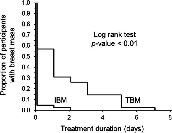 Methods: This randomized controlled trial was conducted at the Lactation Clinic of the Department of Pediatrics, Faculty of Medicine Siriraj Hospital, Mahidol University, Bangkok, Thailand during February 2019-July 2020. Women presenting with acute plugged milk duct were enrolled and randomly allocated to the IBM or TBM/control groups. Mass size in square centimeters (cm2) was calculated by multiplying the perpendicular axes of the mass. Pain score was self-scored by participants using a numerical rating scale. Median time (95% confidence interval [CI]) to resolution of plugged milk duct was derived using Kaplan-Meier survival analysis. Intention-to-treat analysis was performed.