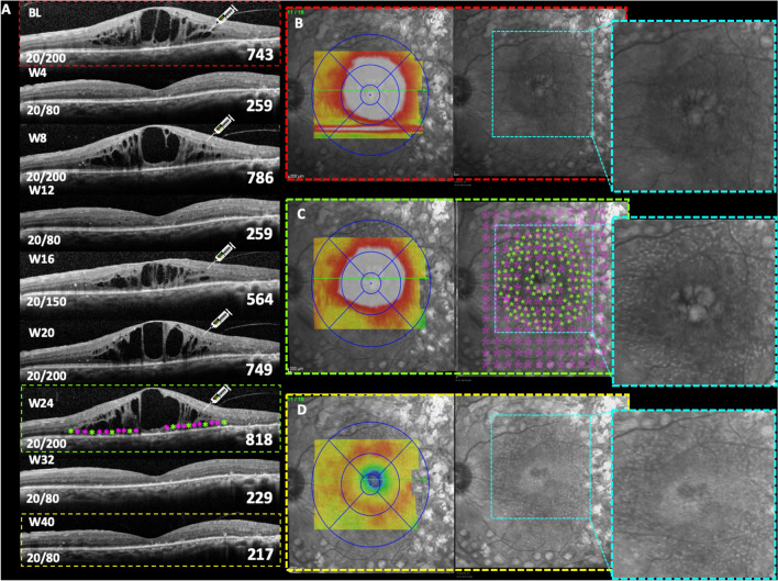 Material and methods: In this consecutive retrospective study, 37 patients (37 eyes) with center-involved (CI) DME were treated with SWiT laser therapy from April 2017 to June 2021. The technique consisted of a mean number of 200 (range number 50-400) SPD laser burns OCT-guided thickened area performed on the juxta- and perifoveal area 500 µm away from the foveal center, overlapping with a mean number of 1000 (range number 800-1200) EpM laser burns focused on 6 mm macular diameter area but saving 300 µm toward the foveal center. All patients underwent ophthalmological evaluations, including BCVA and CST measurement by spectral-domain optical coherence tomography (SD-OCT), before and after SWiT laser therapy. The mean follow-up time was 19.2 months (range 2-60 months).