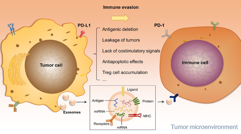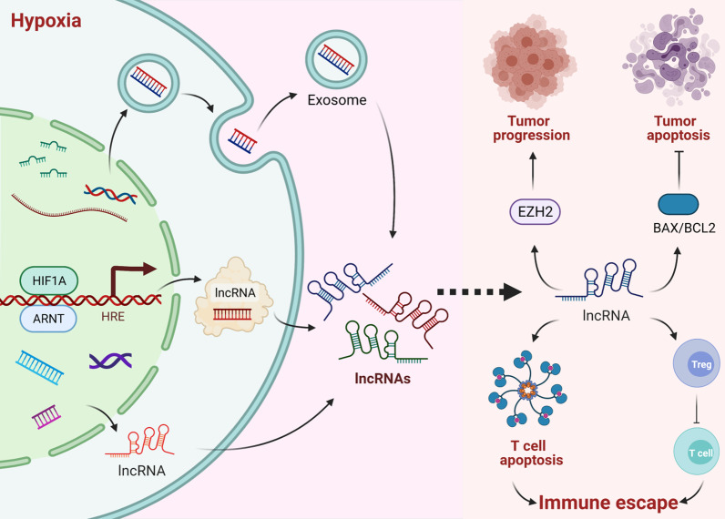 Hypoxia, a common feature of the tumor microenvironment in various types of cancers, weakens cytotoxic T cell function and causes recruitment of regulatory T cells, thereby reducing tumoral immunogenicity. Studies have demonstrated that hypoxia and hypoxia-inducible factors (HIFs) 1 and 2 alpha (HIF1A and HIF2A) are involved in tumor immune escape. Under hypoxia, activation of HIF1A induces a series of signaling events, including through programmed death receptor-1/programmed death ligand-1. Moreover, hypoxia triggers shedding of complex class I chain-associated molecules through nitric oxide signaling impairment to disrupt immune surveillance by natural killer cells. The HIF-1-galactose-3-O-sulfotransferase 1-sulfatide axis enhances tumor immune escape via increased tumor cell-platelet binding. HIF2A upregulates stem cell factor expression to recruit tumor-infiltrating mast cells and increase levels of cytokines interleukin-10 and transforming growth factor-β, resulting in an immunosuppressive tumor microenvironment. Additionally, HIF1A upregulates expression of tumor-associated long noncoding RNAs and suppresses immune cell function, enabling tumor immune escape. Overall, elucidating the underlying mechanisms by which HIFs promote evasion of tumor immune surveillance will allow for targeting HIF in tumor treatment. This review discusses the current knowledge of how hypoxia and HIFs facilitate tumor immune escape, with evidence to date implicating HIF1A as a molecular target in such immune escape. This review provides further insight into the mechanism of tumor immune escape, and strategies for tumor immunotherapy are suggested.