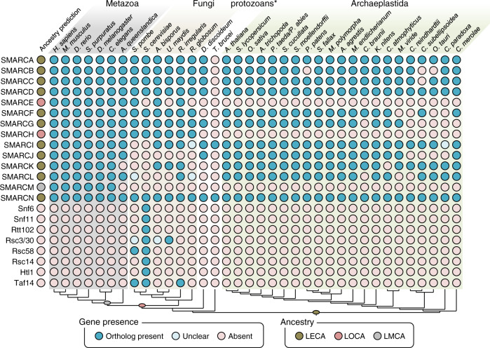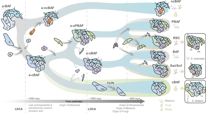 Over millions of years, eukaryotes evolved from unicellular to multicellular organisms with increasingly complex genomes and sophisticated gene expression networks. Consequently, chromatin regulators evolved to support this increased complexity. The ATP-dependent chromatin remodelers of the SWI/SNF family are multiprotein complexes that modulate nucleosome positioning and appear under different configurations, which perform distinct functions. While the composition, architecture, and activity of these subclasses are well understood in a limited number of fungal and animal model organisms, the lack of comprehensive information in other eukaryotic organisms precludes the identification of a reliable evolutionary model of SWI/SNF complexes. Here, we performed a systematic analysis using 36 species from animal, fungal, and plant lineages to assess the conservation of known SWI/SNF subunits across eukaryotes. We identified evolutionary relationships that allowed us to propose the composition of a hypothetical ancestral SWI/SNF complex in the last eukaryotic common ancestor. This last common ancestor appears to have undergone several rounds of lineage-specific subunit gains and losses, shaping the current conformation of the known subclasses in animals and fungi. In addition, our results unravel a plant SWI/SNF complex, reminiscent of the animal BAF subclass, which incorporates a set of plant-specific subunits of still unknown function.