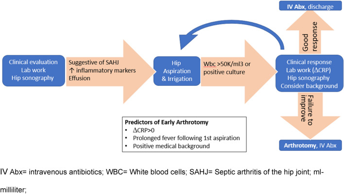 Conclusion: The new algorithm which we present allows an expeditious assessment of the patient's response to the repeated aspiration method and thus prevents unnecessary surgeries for the treatment of SAHJ. Patients with chronic comorbidities, prolonged fever, and an increase in CRP level following the first aspiration, are at risk of treatment failure and should be treated with an arthrotomy.