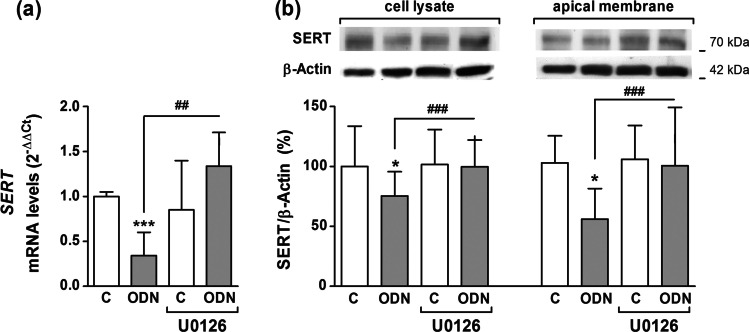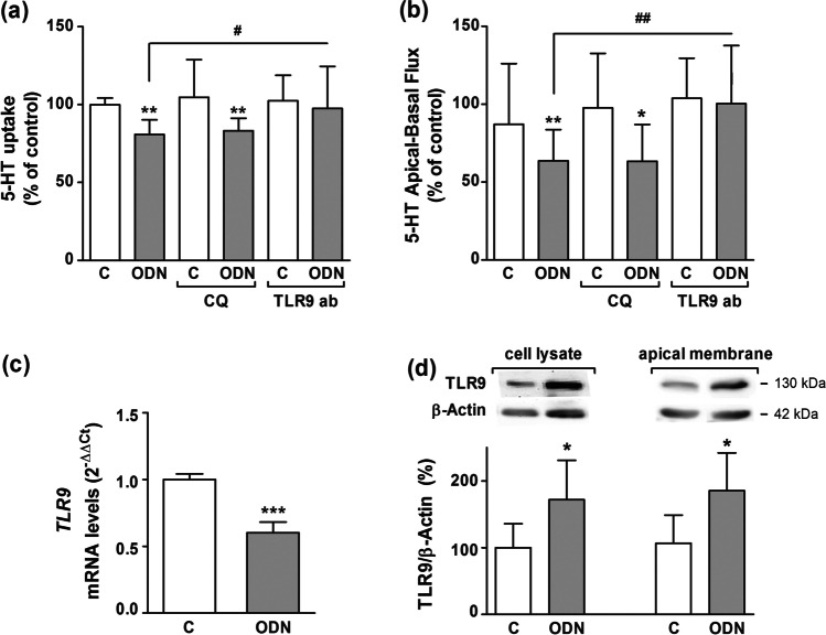 Intestinal serotonergic system is a key modulator of intestinal homeostasis; however, its regulation is still unclear. Toll-like receptor 9 (TLR9), an innate immune receptor, detects different external agents in the intestine, preserving intestinal integrity. Since little is known about TLR9 role in the intestine, our aim was to address the potential regulation between TLR9 and intestinal serotonergic system. Caco-2/TC7 cell line and intestinal tract of Tlr9-/- mice were used in this study. Serotonin uptake studies were performed, and molecular expression of different serotonergic components was analyzed by western blot and real-time PCR. Our results show that TLR9 activation inhibits serotonin transporter activity and expression, involving p38/MAPK and ERK/MAPK intracellular pathways, and reciprocally, serotonin increases TLR9 expression. Supporting this interaction, serotonin transporter, serotonin receptors and serotonin producer enzymes were found altered in intestinal tract of Tlr9-/- mice. We conclude that TLR9 could contribute to intestinal homeostasis by modulation of intestinal serotonergic system.