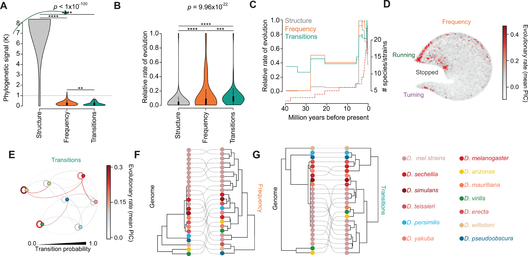 Neural circuits must both execute the behavioral repertoire of individuals and account for behavioral variation across species. Understanding how this variation emerges over evolutionary time requires large-scale phylogenetic comparisons of behavioral repertoires. Here, we describe the evolution of walking in fruit flies by capturing high-resolution, unconstrained movement from 13 species and 15 strains of drosophilids. We find that walking can be captured in a universal behavior space, the structure of which is evolutionarily conserved. However, the occurrence of and transitions between specific movements have evolved rapidly, resulting in repeated convergent evolution in the temporal structure of locomotion. Moreover, a meta-analysis demonstrates that many behaviors evolve more rapidly than other traits. Thus, the architecture and physiology of locomotor circuits can execute precise individual movements in one species and simultaneously support rapid evolutionary changes in the temporal ordering of these modular elements across clades.