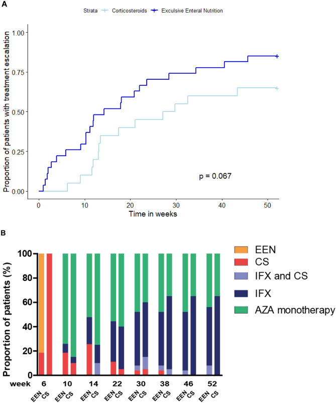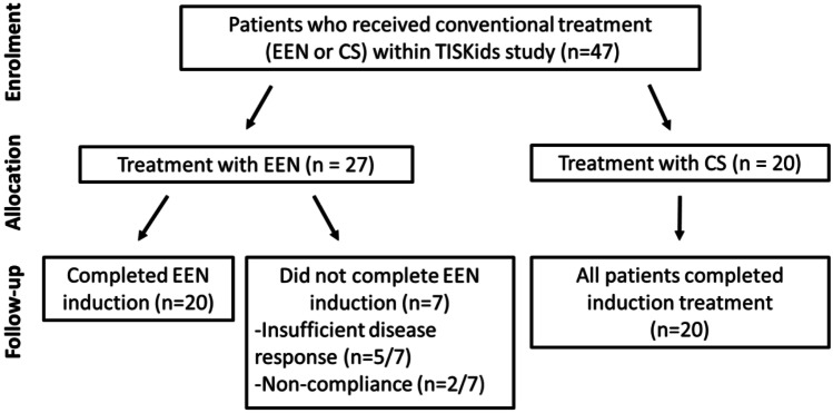 To induce remission in luminal paediatric Crohn's disease (CD), the ESPGHAN/ECCO guideline recommends treatment with exclusive enteral nutrition (EEN) or oral corticosteroids. In newly diagnosed moderate-to-severe paediatric CD patients, we determined the proportion of patients in which EEN or corticosteroids induced remission and maintained remission on azathioprine monotherapy. We included patients from the "TISKids" study assigned to the conventional treatment arm. Patients were aged 3-17 years and had new-onset, untreated luminal CD with weighted paediatric CD activity index (wPCDAI) > 40. Induction treatment consisted of EEN or oral corticosteroids; all received azathioprine maintenance treatment from start of treatment. The primary outcome of this study was endoscopic remission defined as a SES-CD score < 3 without treatment escalation at week 10. Secondary outcomes included proportion of patients without treatment escalation at week 52. In total, 27/47 patients received EEN and 20/47 corticosteroids. At baseline, patient demographics and several inflammation parameters were similar between the two treatment groups. At 10 weeks, clinical remission rates were 7/23 (30%) for EEN and 7/19 (37%) for corticosteroids (p = 0.661). Twenty-nine of 47 consented to endoscopy at 10 weeks, showing endoscopic remission rates without treatment escalation in 2/16 (13%) of EEN-treated patients and in 1/13 (8%) of corticosteroid-treated patients (p = 1.00). At week 52, 23/27 (85%) EEN-treated patients received treatment escalation (median 14 weeks) and 13/20 (65%) corticosteroid-treated patients (median 27 weeks), p = 0.070.Conclusion: In children with moderate-to-severe newly diagnosed CD, induction treatment with EEN or CS regularly is insufficient to achieve endoscopic remission without treatment escalation at week 10. Trial registration number: NCT02517684 What is Known: • Endoscopic remission is associated with a low risk of disease progression. • FL-IFX was superior to conventional treatment in achieving and maintaining remission in paediatric patients with moderate-to-severe CD the first year from diagnosis. What is New: • In children with newly diagnosed moderate-to-severe CD, clinical remission rates and endoscopic remission rates without treatment escalation at week 10 were 30% and 13% after EEN and 37% and 8% after corticosteroid induction treatment. • The current treatment target was often not achieved by either EEN or corticosteroid induction treatment after bridging to azathioprine.