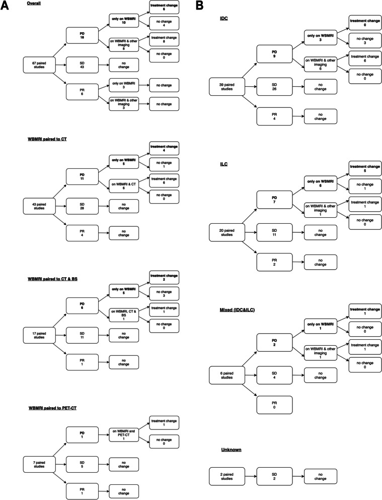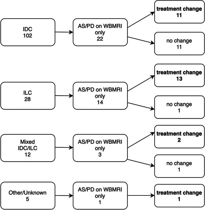 Conclusions: The use of WBMRI in MBC led to earlier recognition of PD and SACT change compared with the other imaging modalities. A higher proportion of discordant response assessments and SACT changes were observed in ILC compared with IDC in our patient group, although larger-scale studies are required to investigate this further.