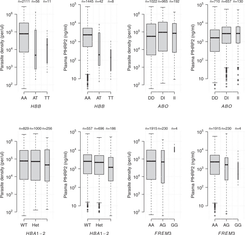 Severe falciparum malaria is a major cause of preventable child mortality in sub-Saharan Africa. Plasma concentrations of P. falciparum Histidine-Rich Protein 2 (PfHRP2) have diagnostic and prognostic value in severe malaria. We investigate the potential use of plasma PfHRP2 and the sequestration index (the ratio of PfHRP2 to parasite density) as quantitative traits for case-only genetic association studies of severe malaria. Data from 2198 Kenyan children diagnosed with severe malaria, genotyped for 14 major candidate genes, show that polymorphisms in four major red cell genes that lead to hemoglobin S, O blood group, α-thalassemia, and the Dantu blood group, are associated with substantially lower admission plasma PfHRP2 concentrations, consistent with protective effects against extensive parasitized erythrocyte sequestration. In contrast the known protective ATP2B4 polymorphism is associated with higher plasma PfHRP2 concentrations, lower parasite densities and a higher sequestration index. We provide testable hypotheses for the mechanism of protection of ATP2B4.