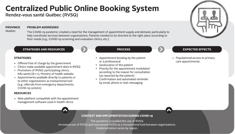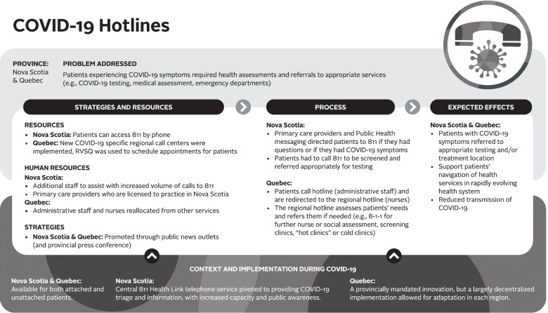 Methods: We conducted a multiple case study based on 63 semi-structured interviews (n = 33 in Quebec, n = 30 in Nova Scotia) conducted between October 2020 and May 2021 and 71 documents from both jurisdictions. We recruited a diverse range of provincial and regional stakeholders (e.g., policy-makers, decision-makers, family physicians, nurses) involved in reorganizing primary care during the COVID-19 pandemic using purposeful sampling (e.g., based on role, region). Interviews were transcribed verbatim and thematic analysis was conducted in NVivo12. Emerging results were discussed by team members to identify salient themes and organized into logic models.