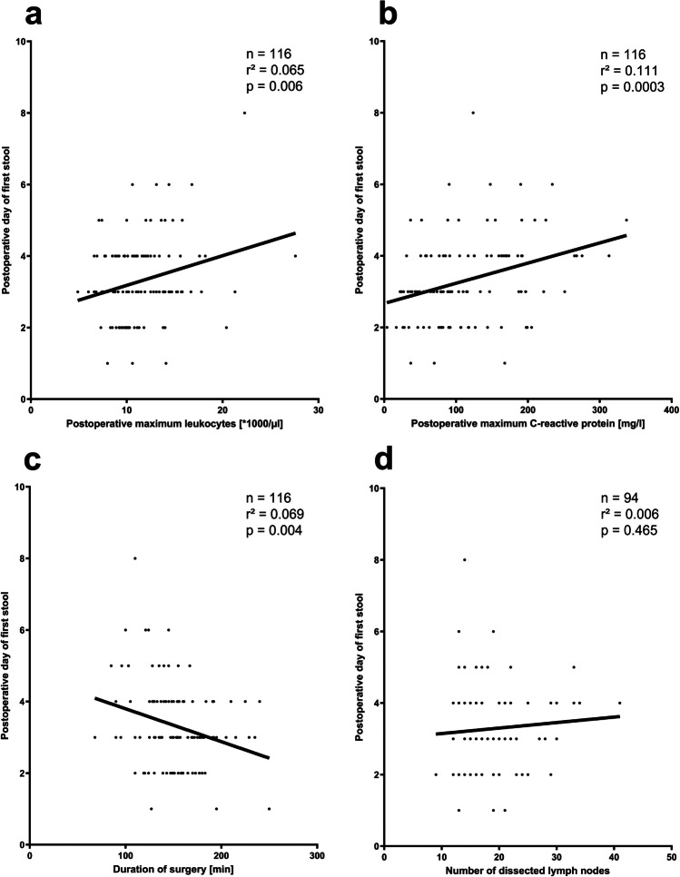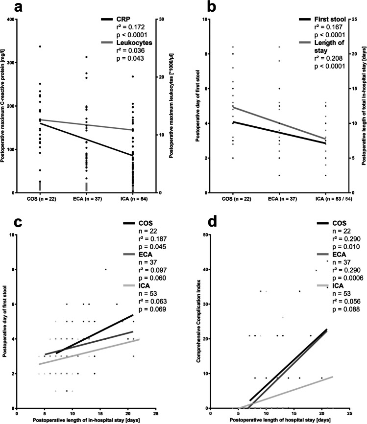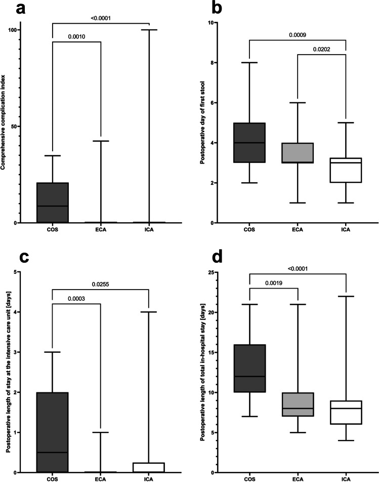Results: The conversion from robotic to open surgery rate was low (overall: 3.2%). Slightly longer duration of surgery had been observed during the early phase after introduction of the robotic program to RC (ECA versus COS, p = 0.044), but not anymore thereafter (versus ICA). No differences were observed in oncologic parameters including rates of tumor-negative margins, lymph node-positive patients, and lymph node yield during mesocolic excision. Both robotic approaches are beneficial regarding postoperative complication rates, especially wound infections, and shorter length of in-hospital stay compared with COS. The duration until first postoperative stool is the shortest after ICA (COS: 4 [2-8] days, ECA: 3 [1-6] days, ICA: 3 [1-5] days, p = 0.0004). Regression analyses reveal neither a longer duration of surgery nor the extent of mesocolic excision, but the degree of minimally invasiveness and postoperative systemic inflammation contribute to postoperative bowel dysfunction, which prolongs postoperative in-hospital stay significantly.