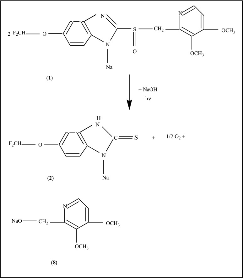 In this work, new optical evidences concerning the changes induced of the UV light on pantoprazole sodium (PS), in solid state and as aqueous solution, are reported by UV-VIS spectroscopy, photoluminescence (PL), Raman scattering and FTIR spectroscopy. New evidences concerning the products of the PS photodegradation pathways are reported by the correlated studies of thermogravimetry and mass spectrometry. The influence of the excipients and alkaline medium on the PS photodegradation is also studied. New aspects regarding the chemical mechanism of the PS photodegradation in the presence of the water vapor and oxygen form air and the alkaline medium are shown. Our results confirm that the PS photodegradation induced of the water vapors and oxygen from air leads to the generation of 5-difluoromethoxy-3H-benzimidazole-2-thione sodium, 5-difluoromethoxy-3H-benzimidazole sodium, 2-thiol methyl-3, 4-dimethoxypyridine and 2-hydroxymethyl-3, 4-dimethoxypyridine, while in the alkaline medium, compounds of the type of the 2-oxymethyl-3,4-dimethoxypyridine sodium salts are resulted.