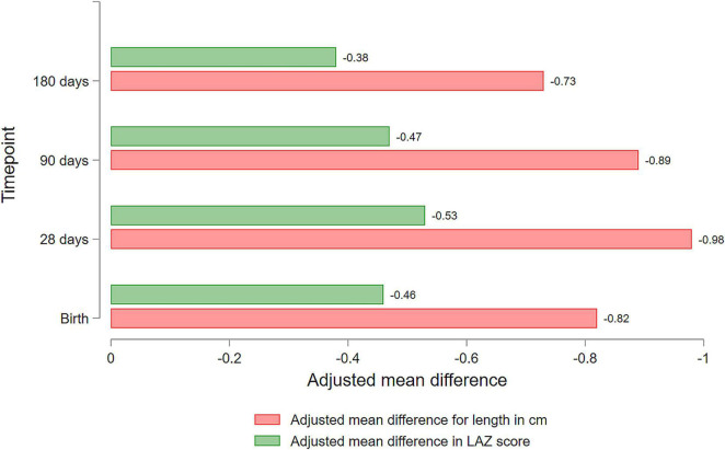 Results: Low birthweight small-for-gestational-age infants had a higher risk of stunting, lower attained length, and a lower LAZ score throughout the first 6 months of life compared with AGA-LBW infants, with differences being maximum at 28 days and minimum at 6 months of age. The linear growth velocity in SGA-LBW infants compared with AGA-LBW infants was significantly lower during the birth-28 day period [MD -0.19, 95% confidence interval (CI): -0.28 to -0.10] and higher during the 3- to 6-month period (MD 0.17, 95% CI: 0.06-0.28). Among the SGA-LBW infants, 55% showed catch-up growth for length at 6 months of age. Lower wealth quintiles, high birth order, home birth, male child, term delivery, non-exclusive breastfeeding, and pneumonia were associated with the higher risk of poor catch-up in linear growth among SGA-LBW infants.