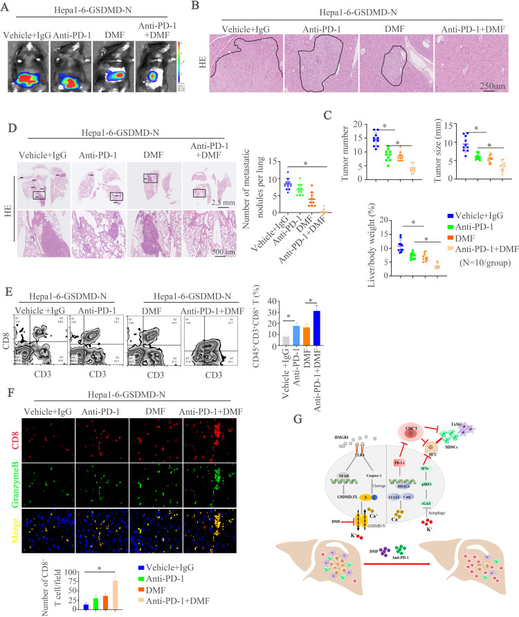 Results: The expression of GSDMD and GSDMD-N was upregulated in HCC tissues or metastatic HCC tissues and positive GSDMD expression indicated grim prognosis. Diethylnitrosamine/carbon tetrachloride or thioacetamide-treated GSDMD-/- mice exhibited decreased liver tumors. In contrast, AAV9-FLEX-GSDMD-N promoted hepatocarcinogenesis. RNA sequencing manifested that knockout of GSDMD impacted the cyclic GMP-AMP synthase (cGAS) pathway and immune-associated pathway. GSDMD damped cGAS activation by promoting autophagy via outputting potassium (K+) and promoted programmed death ligand-1 (PD-L1) expression by histone deacetylases/signal transducer and activator of transcription 1 (STAT1)-induced transactivation of PD-L1 via importing calcium (Ca2+). High Mobility Group Box 1/toll-like receptor 4 (TLR4)/caspase-1 pathway contributed to the overexpression and cleavage of GSDMD. Anti-PD-1 combining with DMF largely impaired HCC progression and metastasis.