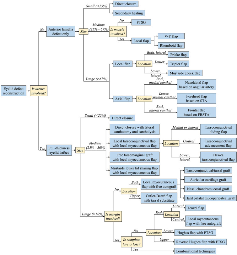 Reconstruction of eyelid defects, especially the posterior lamella, remains challenging because of its anatomical complexity, functional considerations, and aesthetic concerns. The goals of eyelid reconstruction include restoring eyelid structure and function and achieving an aesthetically acceptable appearance. An in-depth understanding of the complex eyelid anatomy and several reconstructive principles are mandatory to achieve these goals. Currently, there are multiple surgical treatment options for eyelid reconstruction, including different flaps, grafts, and combinations of them. This comprehensive review outlines the principles of reconstruction and discusses the indications, advantages, and disadvantages of currently available surgical techniques. We also propose our clinical thinking for solving specific clinical questions in eyelid reconstruction and offer perspectives on new potential methodologies in the future.