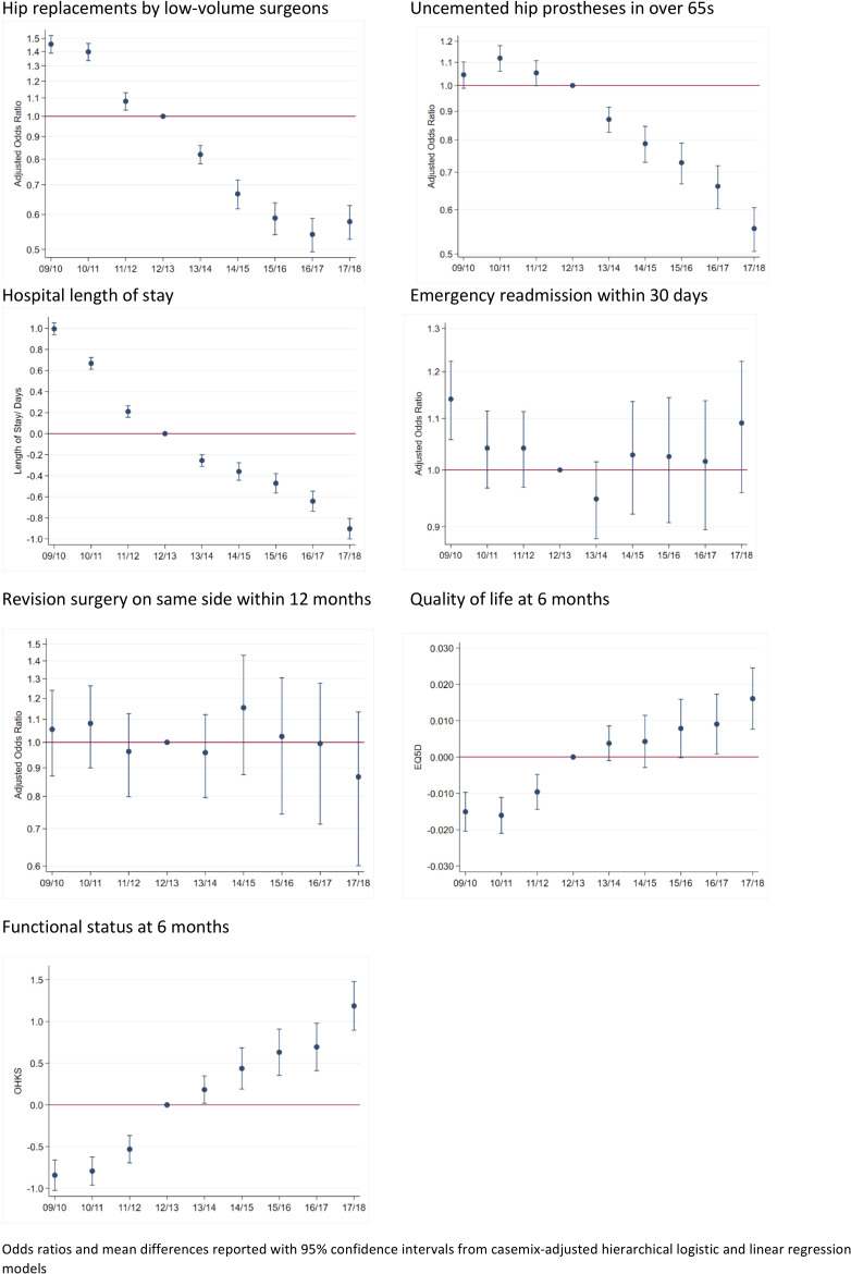 Main outcome measures: Number of procedures conducted by low volume surgeons; use of uncemented hip implants in patients >65; arthroscopy in year prior to knee replacement; hospital length of stay; emergency readmissions within 30 days; revision surgery within 1 year; health-related quality of life and functional status.