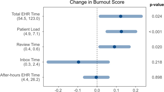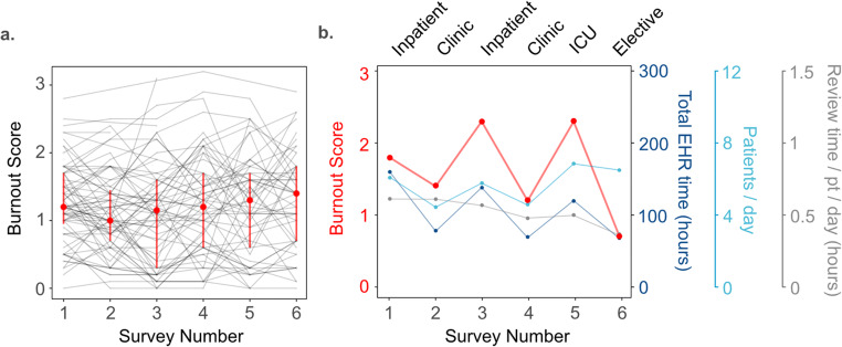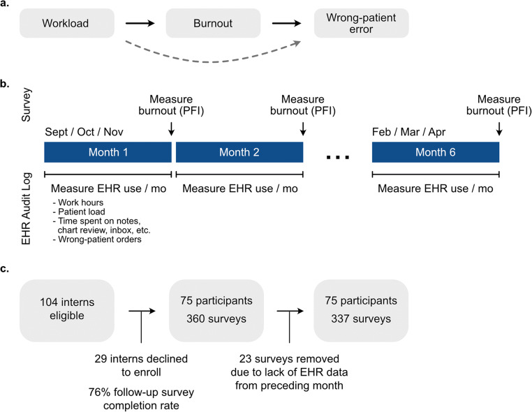 Key results: Seventy-five of 104 interns enrolled (72.1%) in the study. A total of 337 surveys and 8,863,318 EHR-based actions were analyzed. Median burnout score across the cohort across all time points was 1.2 (IQR 0.7-1.7). Individual-level burnout was variable (median monthly change 0.3, IQR 0.1-0.6). In multivariable analysis, increased total EHR time (β=0.121 for an increase from 54.5 h per month (25th percentile) to 123.0 h per month (75th percentile), 95%CI=0.016-0.226), increased patient load (β=0.130 for an increase from 4.9 (25th percentile) to 7.1 (75th percentile) patients per day, 95%CI=0.053-0.207), and increased chart review time (β=0.096 for an increase from 0.39 (25th percentile) to 0.59 (75th percentile) hours per patient per day, 95%CI=0.015-0.177) were associated with an increased burnout score. After adjusting for the total number of ordering sessions, burnout was not statistically associated with an increased rate of wrong-patient orders (rate ratio=1.20, 95%CI=0.76-1.89).