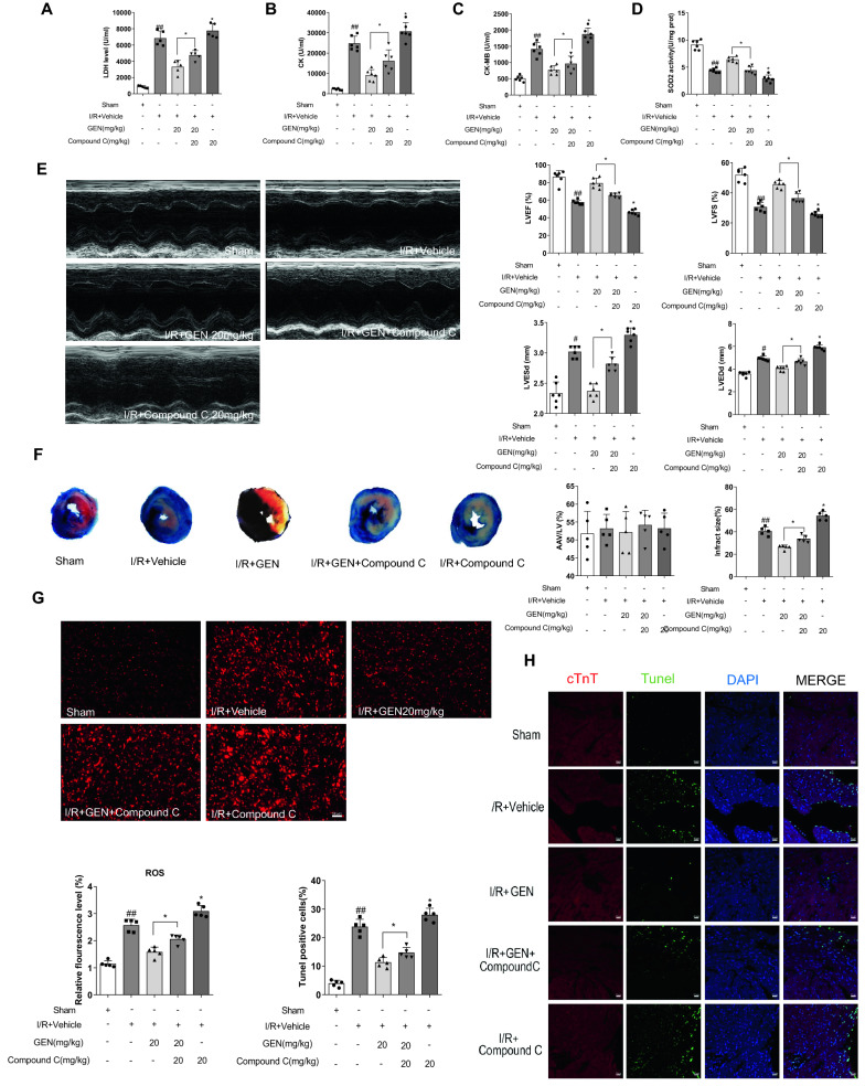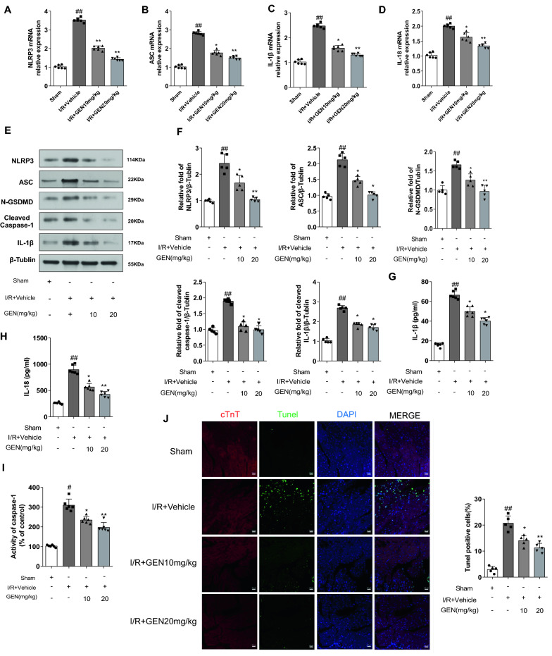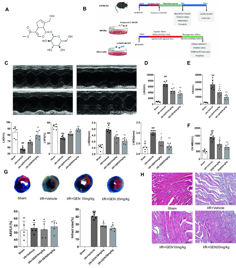 Methods: The MIRI model of animal was created in male C57BL/6J mice and the hypoxia reoxygenation (H/R) model was established for the in vitro experiments. Neonatal rat ventricular myocytes (NRVMs) and H9c2 cells with knockdown of TXNIP or NLRP3 were used. Geniposide was administered to mice before vascular ligation. HE staining, 2,3,5-triphenyltetrazolium chloride (TTC) staining, echocardiography, oxidative stress and myocardial enzyme detection were used to evaluate the cardioprotective effect of geniposide. Meanwhile, pharmacological approaches of agonist and inhibitor were used to observe potential pathway for geniposide cardioprotective in vitro and in vivo. Moreover, ELISA kits were adopted to detect the levels of inflammatory factors, such as IL-1β and IL-18. The gene and protein expression of NLRP3 and pyroptosis-related factors in heart tissue were performed by RT-PCR, western blotting and immunofluorescence in vivo and in vitro, respectively.