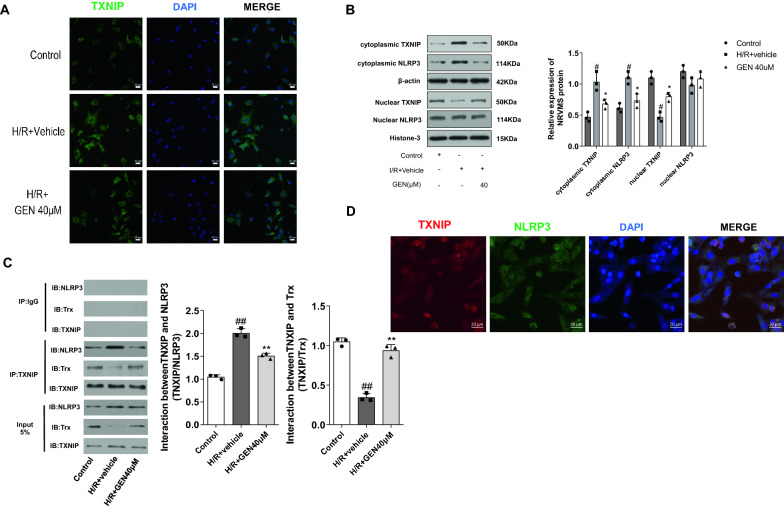 Results: Our results indicate that geniposide can reduce the area of myocardial infarction, improve heart function, and inhibit the inflammatory response in mice after MI/RI. In addition, RT-PCR and western blotting shown geniposide promoting AMPK phosphorylation to activate myocardium energy metabolism and reducing the levels of genes and proteins expression of NLRP3, ASC, N-GSDMD and cleaved caspase-1, IL-1β, IL-18. Meanwhile, geniposide improved NRVMs energy metabolism, which decreased ROS levels and the protein expression of TXNIP and thus suppressed the expression of NLRP3. AMPK antagonist or agonist and siRNA downregulation of TXNIP or NLRP3 were also verify the effect of geniposide against H/R injury. Further research found that geniposide promoted the translocation of TXNIP and reduce the binding of TXNIP and NLRP3.