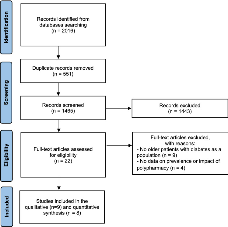 Results: From a total of 1465 records, 9 were selected for the qualitative synthesis, and 8 for the quantitative synthesis. Most studies defined polypharmacy using a cut-off for the minimum number of medications ranging from 4 to 6 drugs/day. The pooled prevalence of polypharmacy in older people with diabetes was 64% (95% CI 45-80%). Considering studies that used the same definition of polypharmacy (i.e. ≥ 5 drugs/day), the pooled prevalence was 50% (95% CI 37-63%). The between-studies heterogeneity was high. Across the selected studies, polypharmacy seemed to negatively influence both diabetes-specific (poor glycemic control and risk of hypoglycemia) and health-related (risk of incident falls, syncope, hospitalization, and death) outcomes.