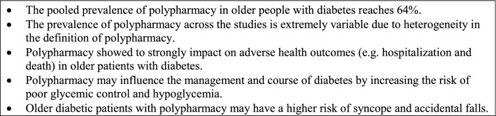 Conclusion: This systematic review confirms the high prevalence of polypharmacy in older people with diabetes and its strong impact on several health-related outcomes, including mortality. These results strengthen the need to improve care strategies for management of these patients.