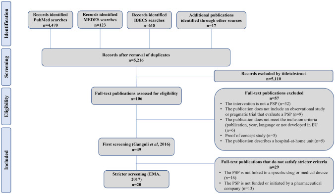 Methods: A systematic literature review, supplemented by a broad search of gray literature, was conducted following PRISMA (Preferred Reporting Items for Systematic Reviews and Meta-Analyses) and Cochrane recommendations. Observational studies and pragmatic trials conducted in Europe to evaluate the impact of patient support programs, published in English or Spanish between 17/03/2010 and 17/03/2020, were reviewed. Two patient support program definitions were applied starting with Ganguli et al.'s broad approach, followed by the European Medicines Agency definition, narrowed to Marketing Authorization Holders organized systems and their medicines. The quality of publications was assessed using the STROBE (Strengthening the Reporting of Observational Studies in Epidemiology) statement 22-item checklist.